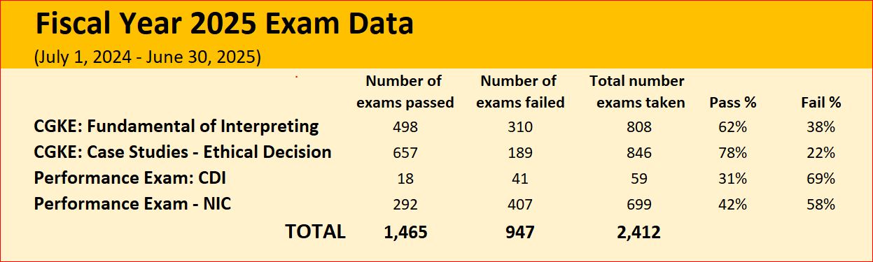 The pass/fail rates presented below are that of all test-takers during that fiscal year and the percentages are indicative of the readiness of the entire pool of candidates for certification, rather than any specific group of (e.g. heritage ASL-users vs. ASL-as-a-second-language users), or any individual candidate (e.g. many erroneously believe that if the passing rate for an exam is 50%, an individual candidate will have a 50/50 chance of passing.)